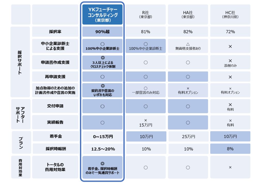 他の支援機関様(特に個人の士業事務所など)では、多くの案件を効率的に処理するために1名体制での支援が行われることが多く、審査項目の取りこぼしが発生し、結果として不採択に繋がってしまいます。